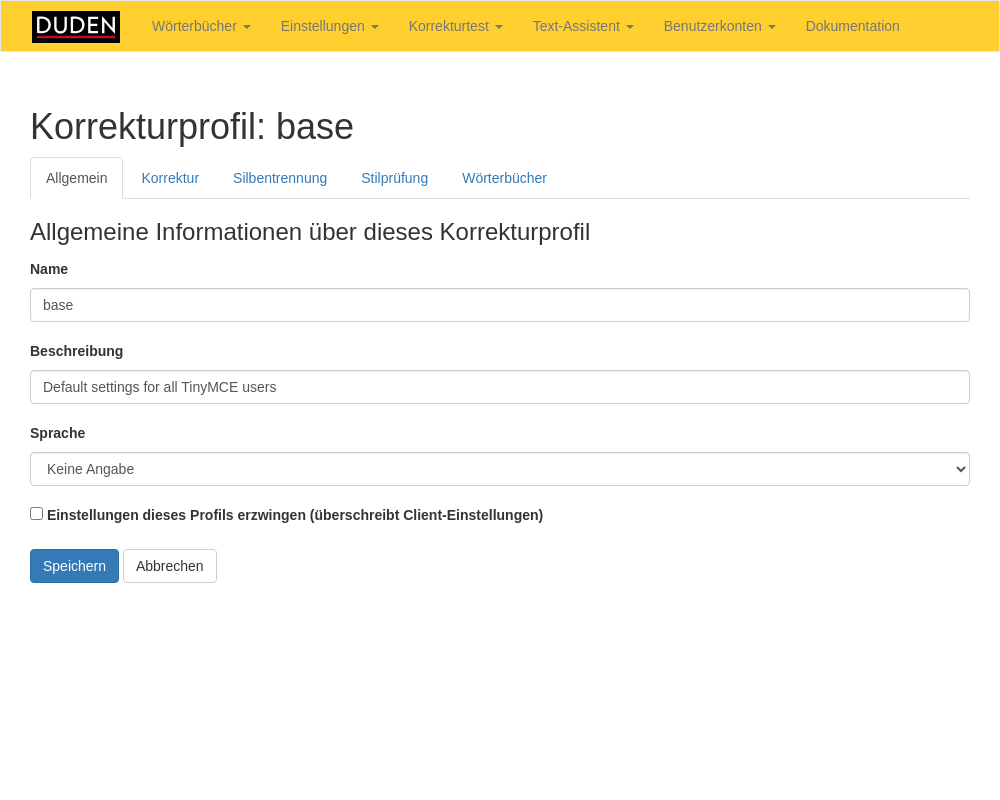 In der Standardkonfiguration des TinyMCE Plug-ins wird immer ein Korrekturprofil namens base verwendet, soweit dieses auf dem Server angelegt worden ist.